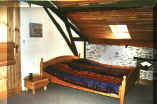 OG: unter der Dachschräge: großes Schlafzimmer mit Doppelbett (180 cm) und Sitzgruppe, Schlafzimmer mit Doppelbett (140 cm), Schlafzimmer mit Doppelbett (140 cm) und Einzelbett (90 cm) sowie Schreibtische, Teppichfußboden, Bad mit Badewanne und WC
